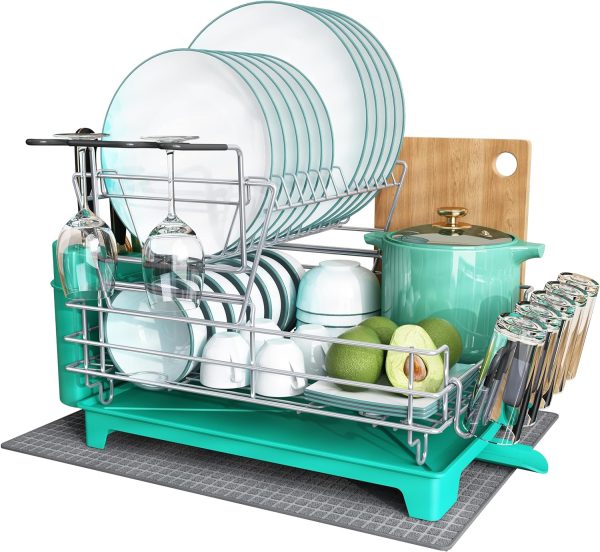 Dish Drying Rack and Drainboard Set, 2 Tier Stainless Steel Large Dish Strainer with Drainage, Utensil Holder and Extra Drying Mat, Dish Strainers for Kitchen Counter (Turquoise)