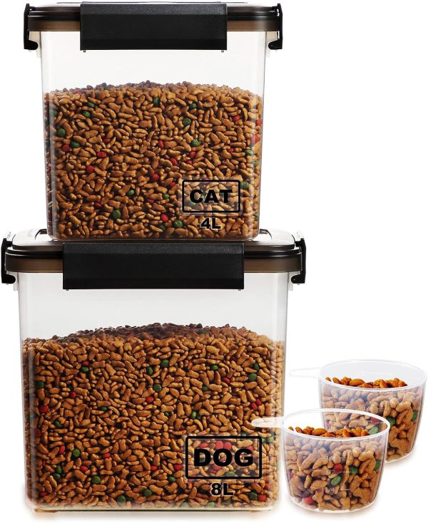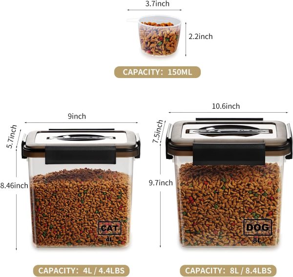 2-Pack Airtight Pet Food Storage Containers with Measuring Cup,Portable Handle for Dog Treats, Cat Dry Food Bin,Kitchen Container (8L+4L,Grey)
