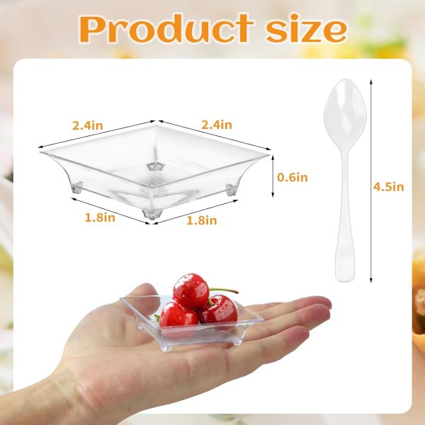 100 Sets 2.4” Mini Dessert Plates with Tasting Spoons, Clear Disposable Mini Plastic Tray, Mini Square Plastic Dish for Sauce, Dessert, Fruit or Appetizer