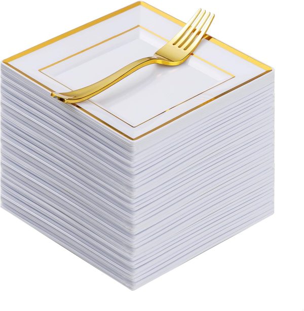 120 Pieces Gold Square Plastic Plates with Forks, Gold Dessert Plates for 60 Guests, Heavy Duty Disposable Plates for Party, Including 60 6.5″ Plastic Plates and 60 7.4″ Forks