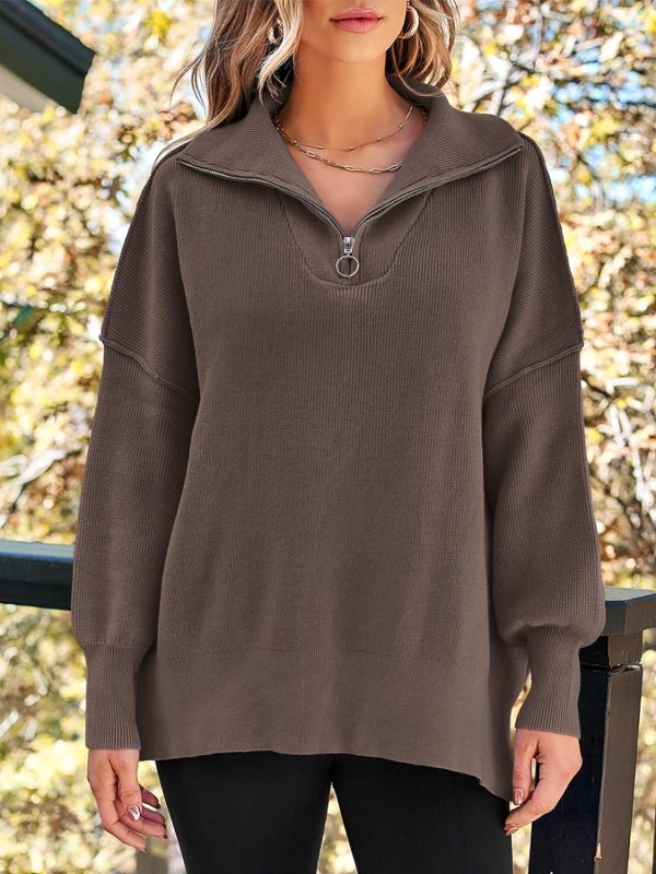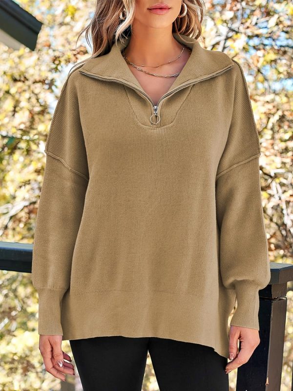 Women’s Sweaters 2023 Winter Zipper Collared Oversized Drop Shoulder Tunic Pullover Knit Sweater Tops