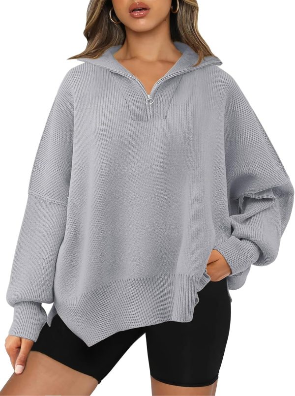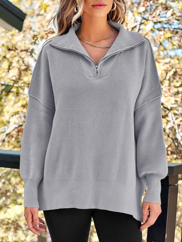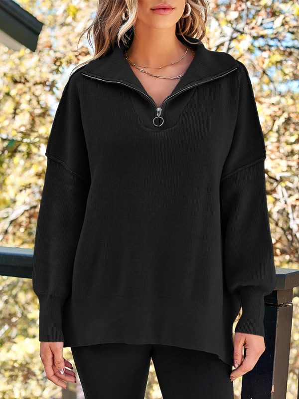 Women’s Sweaters 2023 Winter Zipper Collared Oversized Drop Shoulder Tunic Pullover Knit Sweater Tops