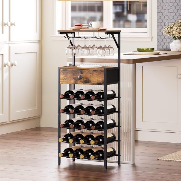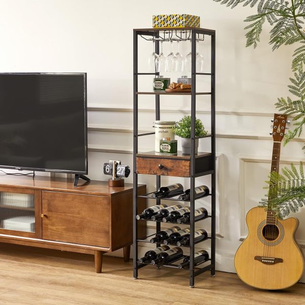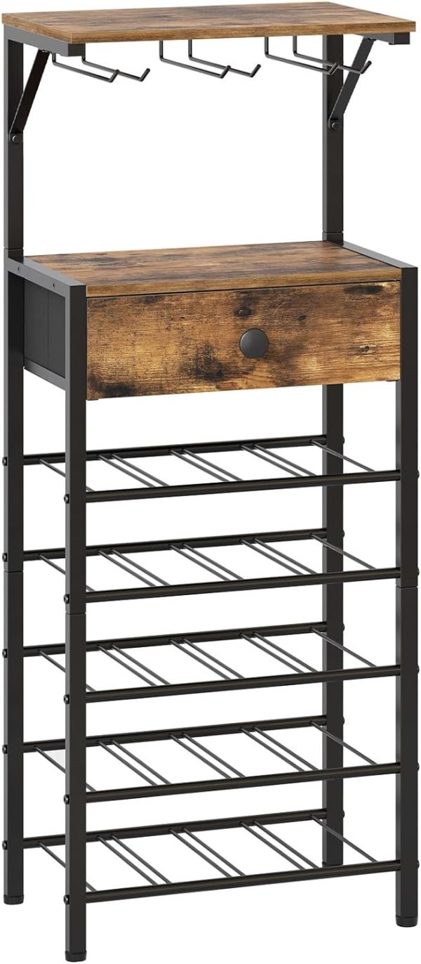 Wine Rack Freestanding Floor, 20-Bottle Bar Cabinet, 5-Tier Wine Storage Rack, with Wine Glass Holders, Non-Woven Fabric Drawer, for Dining Room, Living Room, Rustic Brown and Black JJ06BR