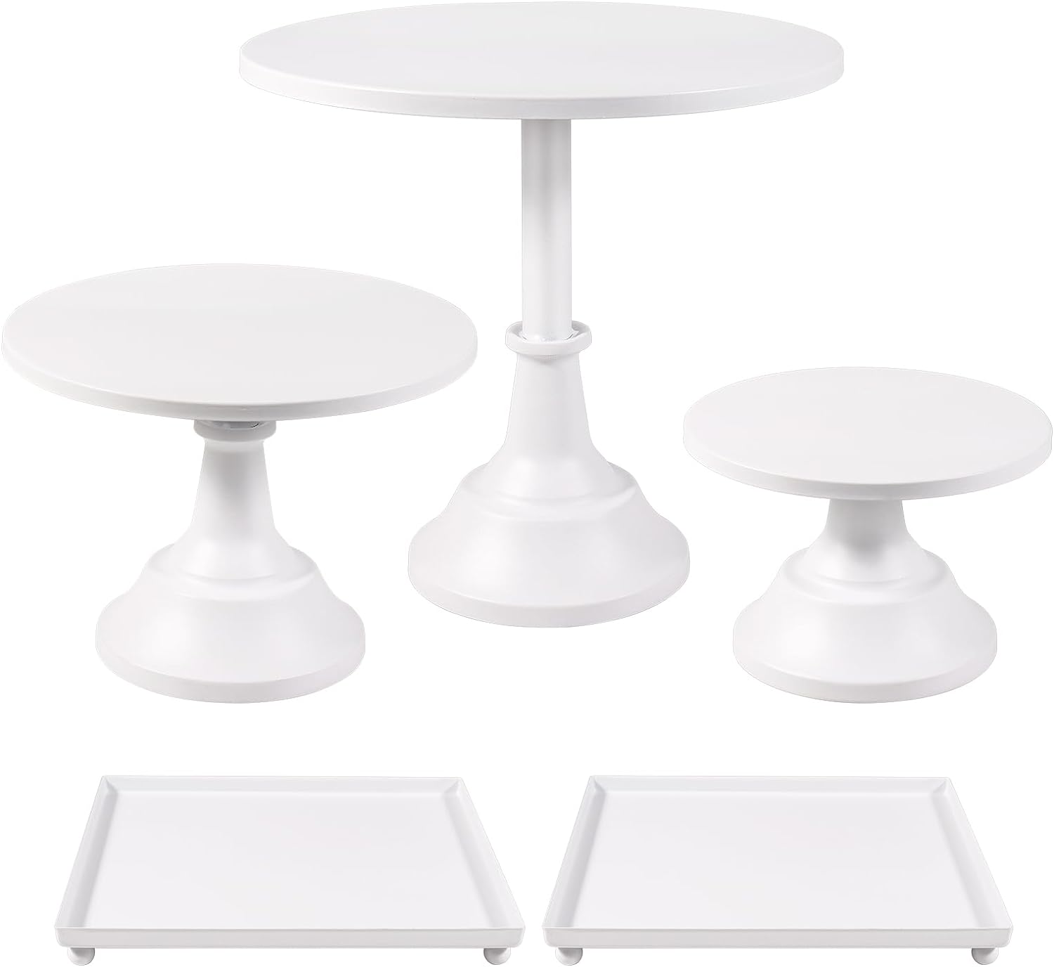 - Dessert Table Display Set: This wedding cake stand set includes three sizes of cake pedestal stands and two small square trays for displaying beautiful cakes, pastries, muffins, biscuit appetizers, or other tasty treats.